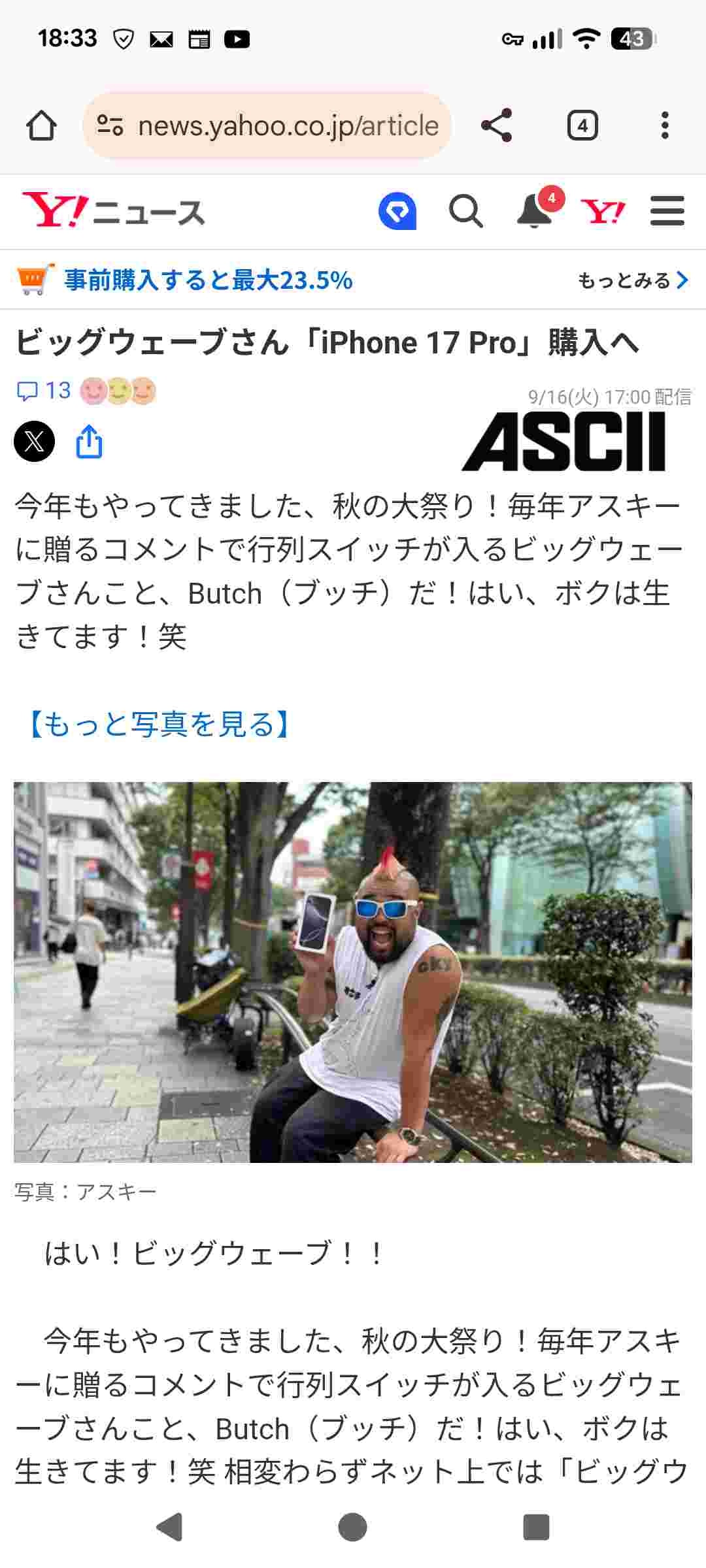 ビッグウェーブさん「iPhone 17 Pro」購入へ
