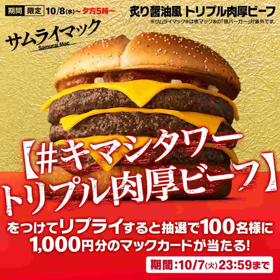 マクドナルドのキャンペーンは、X中で実施しているもの。ハッシュタグ「#キマシタワートリプル肉厚ビーフ」を付けてリプライを送ることで、抽選で100人に1000円分のマックカードが当たる。