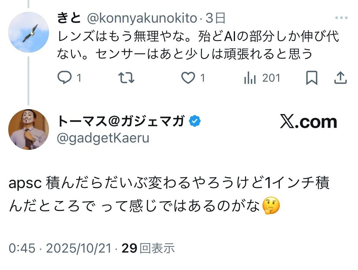 技術こフレイクスルーがおこって1/2インチセンサーでフルサイズの性能だせるようになるんでしょ、どうせ