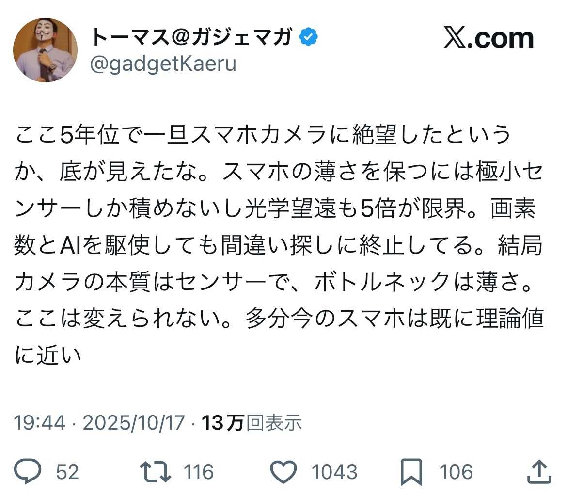 そもそも一眼レフとか専用カメラには絶対勝てないという縛りでどれだけやれるかという世界でしょ、それが限界になってるからAIやお手軽な画像処理とか付加価値を売りにするようになったとアホでもわかるわ
