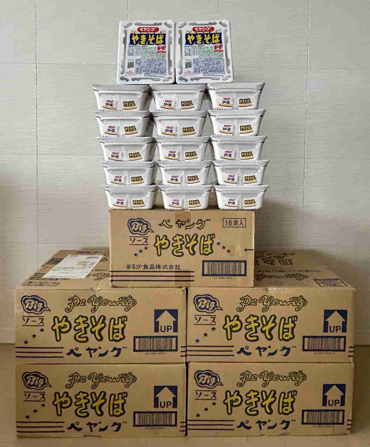 ペヤング一年分(360食)当選!! ネタで応募したんですが 全国で5名の狭き門をくぐり抜け まさかの当選! 写真は90食分 あと3回来るって えぐっ😂 佐川の兄さん笑ってた😆