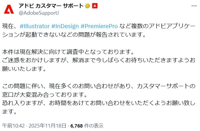 11月18日朝から、「Illustrator」「InDesign」「PremierePro」などのAdobe製品が起動しないとの報告が、SNSで多数あがっている。