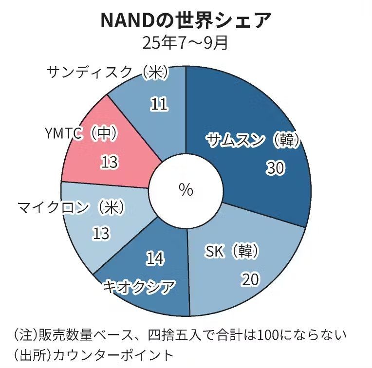 データ保存に使うメモリー分野で中国の存在感が増している。長期記憶に使うNAND大手の長江存儲科技(YMTC)は販売数量シェアが初めて10%を超えた。米中対立を背景に自国の半導体を使うよう促す中国政府の優遇策で技術力を急速に高めた。現在は中国国内が中心だが、キオクシアホールディングスなど日米韓各社の経営への影響は避けられない。以下ソース
