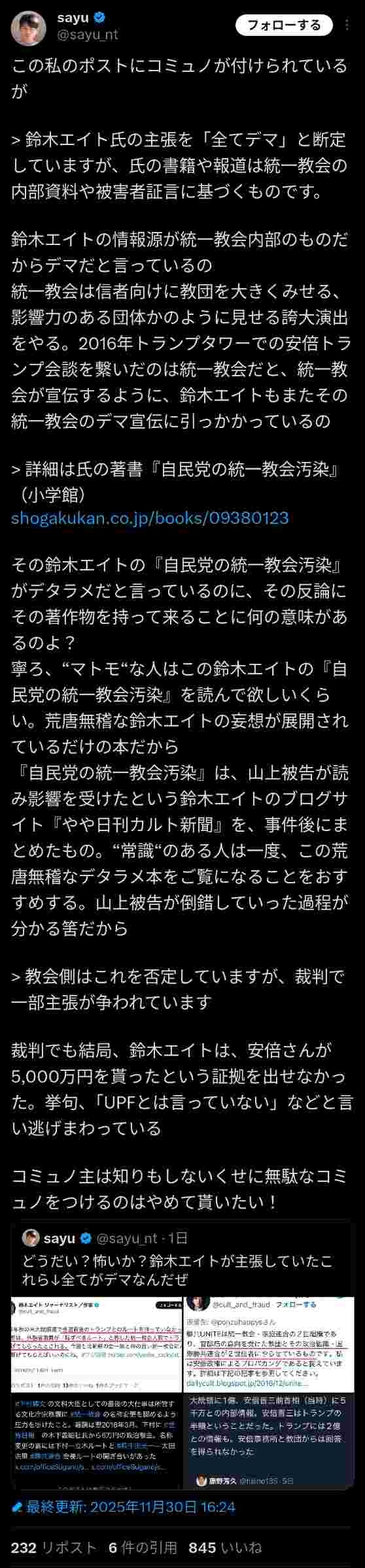 鈴木エイトの発信の根拠は統一教会 ”のデマ” だという主張なのか