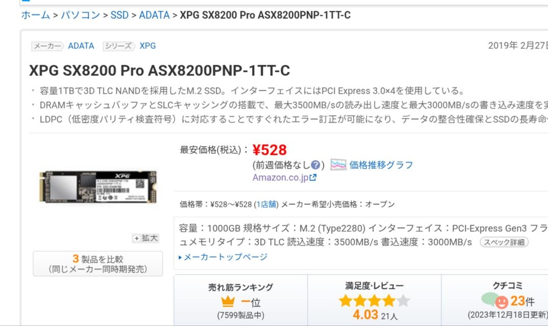 価格コムで1TB SSDがなんと 528円(税込) あだーたのXPG SX8200 Pro