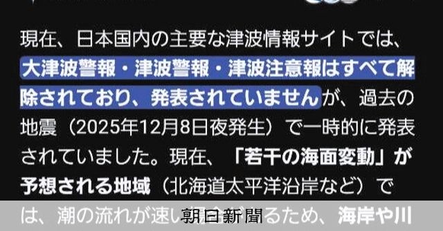 しかし、津波警報や注意報が続いていた9日午前2時10分ごろ、記者がグーグルで「最新の津波情報について教えて」と検索すると、「AIによる概要」には「現在、大津波警報・津波警報・津波注意報はすべて解除されており、発表されていません」と表示された。