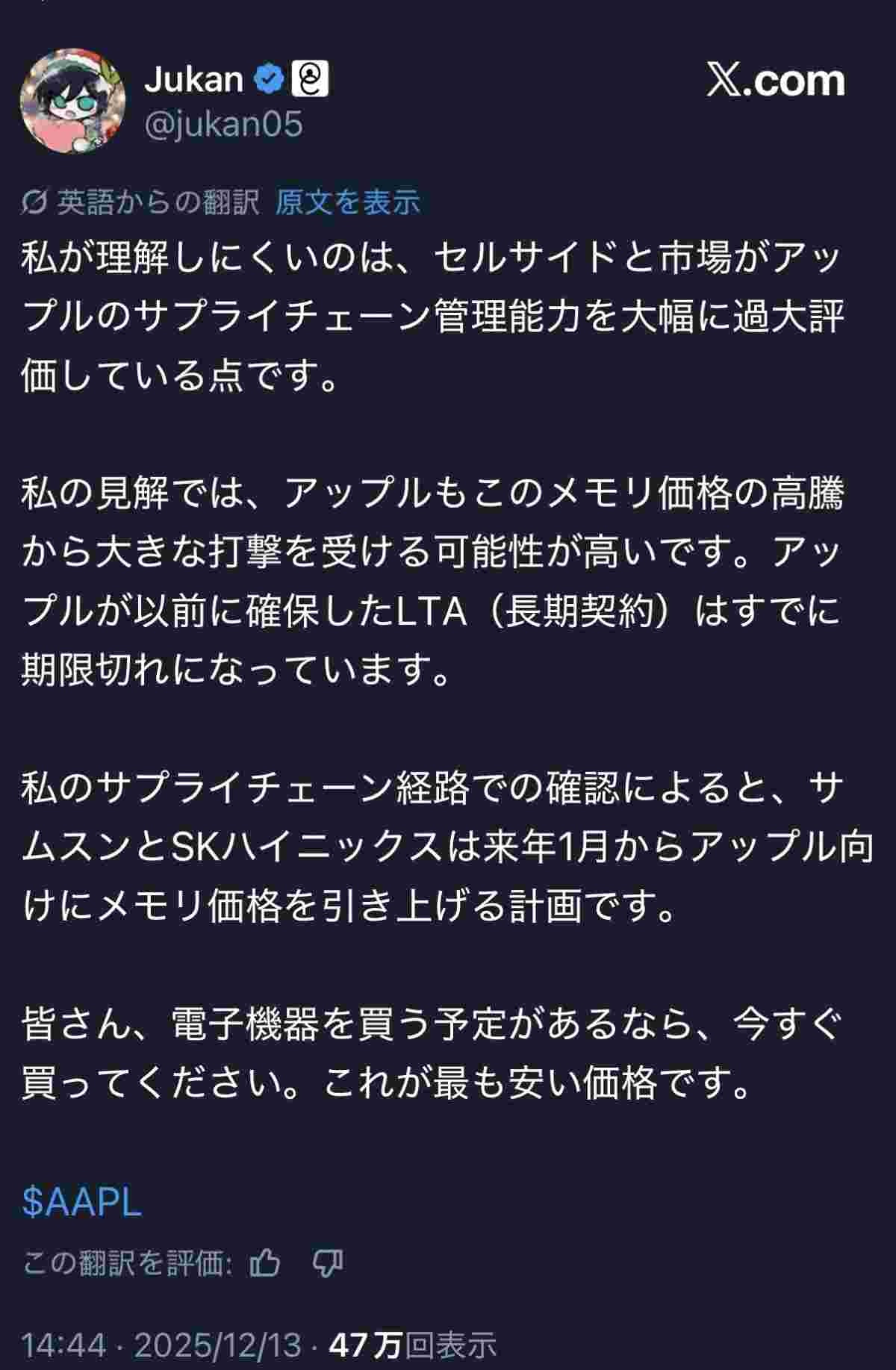私の見解では、アップルもこのメモリ価格の高騰から大きな打撃を受ける可能性が高いです。アップルが以前に確保したLTA(長期契約)はすでに期限切れになっています。