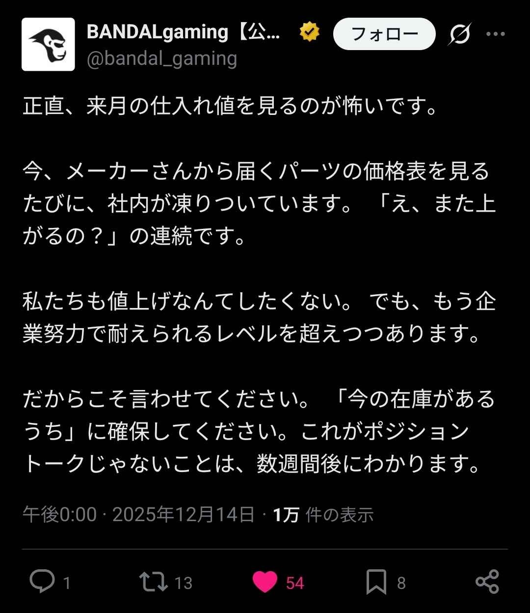 日本のBTO業者なんて相手にされてないんだから物が無くて値上げ以前の問題だぞ