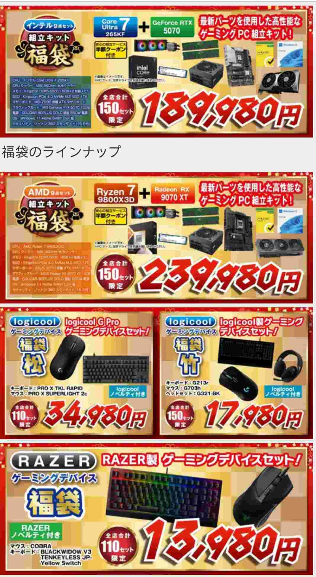 恒例の「初夢福袋」について、2026年はIntel(Core Ultra 265KF、メモリ32GB、GeForce RTX 5070など)とAMD(Ryzen 7 9800X3D、メモリ32GB、Radeon RX 9070 XTなど)それぞれをテーマにした組立キット福袋が、それぞれ全店合計150セットずつ限定で販売される。価格はそれぞれ18万9,980円、23万9,980円。また、ゲーミングデバイス福袋として、Logicoolをテーマに松(3万4,980円)と竹(1万7,980円)の2種、およびRazerをテーマにした福袋(1万3,980円)が用意される。