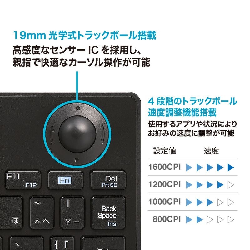 トラックボールは4段階の速度調整機能を搭載。細かなクリック操作が必要なプレゼンテーションの場面や、フルHDモニターから高解像度4KモニターでのPC操作など幅広い環境で使用できる。