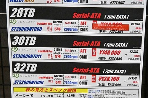 初の32TB HDDがSeagateから登場、「IronWolf Pro」シリーズの「ST32000NT000」の販売開始を12月27日(土)の調査で確認した。回転数7,200rpm、キャッシュメモリ容量512MBで、価格は138,160円。ただし、直近調査の1月10日(土)時点では品切れとなっている。値動きの面では、HDD全体が大きく値上がり。在庫ショップ数も減って品薄や品切れが目立つ。