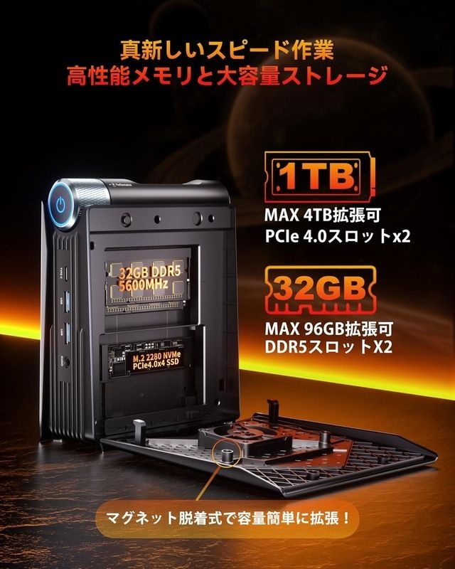 CPU以外の仕様は、メモリが32GB、ストレージがSSD 1TB(最大4TB)、OSはWindows 11 Pro。なお、メモリはDDR5のSO-DIMMが2基で最大96GB、ストレージはM.2 2280が2基で最大4TBまで拡張可能。