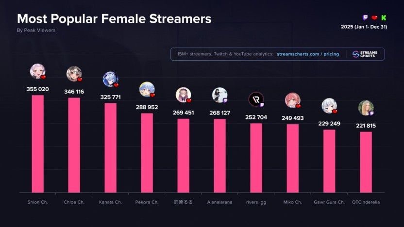 YouTubeやTwitchなどの配信プラットフォームを分析するウクライナのWebサービス「Streams Charts」が、2025年における女性配信者の延べ視聴時間数トップ10を発表した。