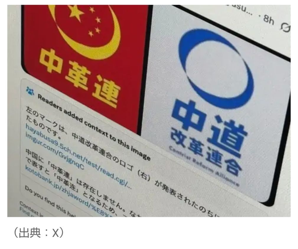 具体的な事例は挙げていないが、X上では赤をベースに「中革連」と書かれたロゴと中道改革連合のロゴを並べ、「中国の中革連とほぼ同じロゴなのはなぜ?」という文言を添えた投稿が出回っており、これを指しているとみられる。