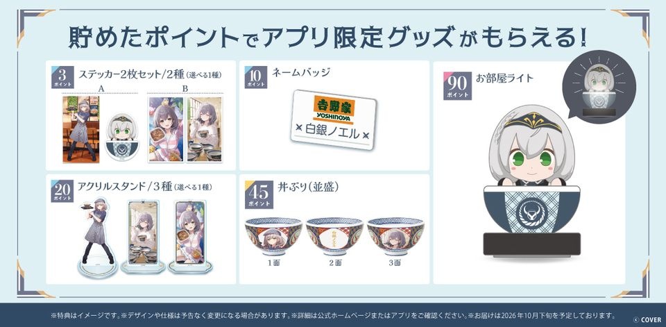 「牛丼好き」を公言している「白銀ノエル」をモデルに、吉野家を起点としたさまざまなシーンのイラストを描き下ろしており、吉野家公式アプリで貯めたポイントに応じてオリジナルのステッカーやアクリルスタンド、丼ぶりなどと交換できる。