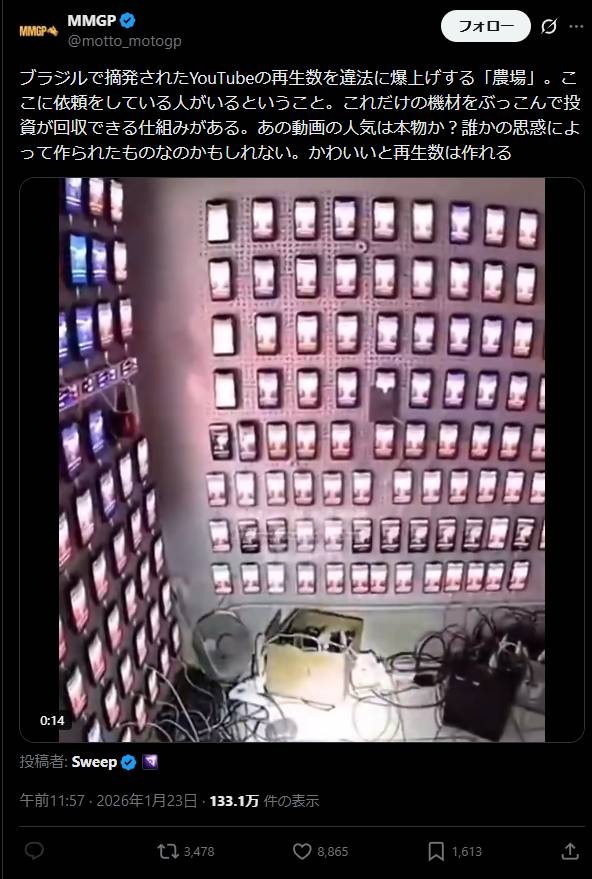 ユーチューバーやvチューバーなどの配信の同時接続数や再生数を水増しするスマホ農場が発見される…