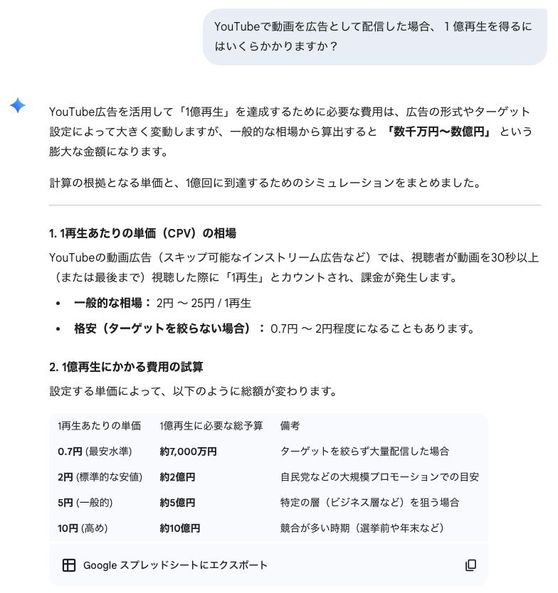 Gemini「高市の動画が1億再生を超えたのはYouTube広告のおかげ、それには約10億円かかります」