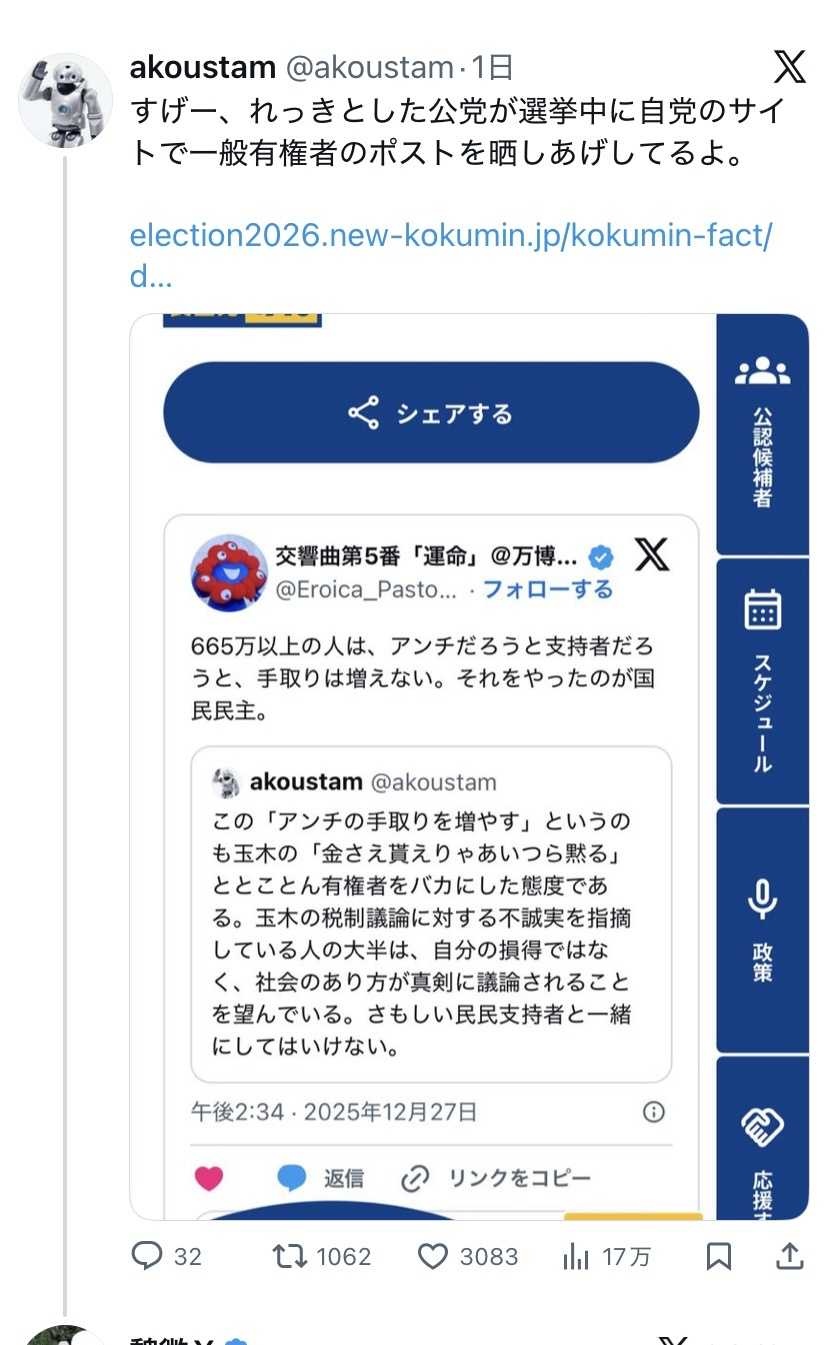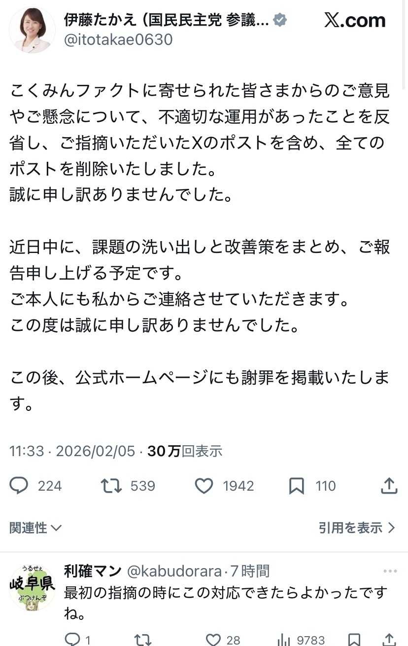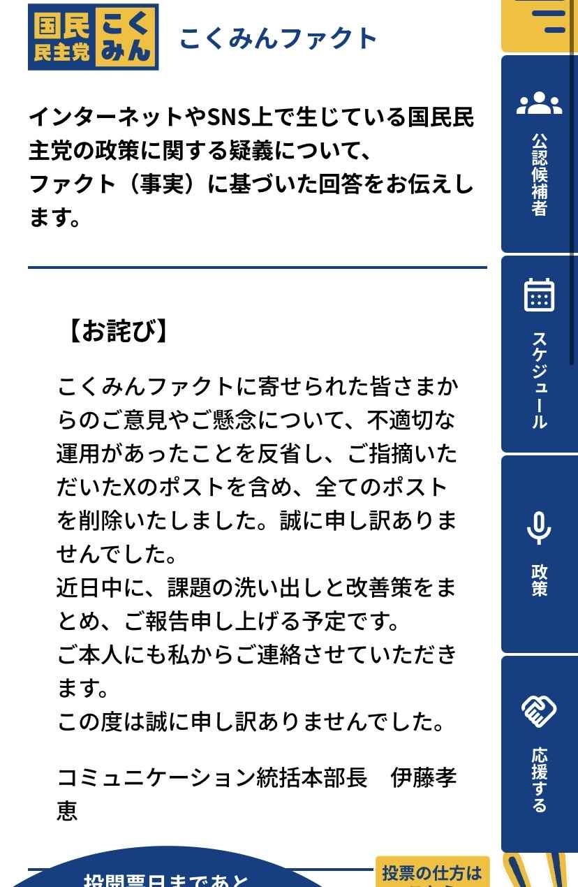 これを受け、党側は「こくみんファクトに寄せられた皆さまからのご意見やご懸念について、不適切な運用があったことを反省し、ご指摘いただいたXのポストを含め、全てのポストを削除いたしました。誠に申し訳ありませんでした。近日中に、課題の洗い出しと改善策をまとめ、ご報告申し上げる予定です。ご本人にも私からご連絡させていただきます。この度は誠に申し訳ありませんでした。 コミュニケーション統括本部長 伊藤孝恵」とする、伊藤氏名のおわび文を掲載した。