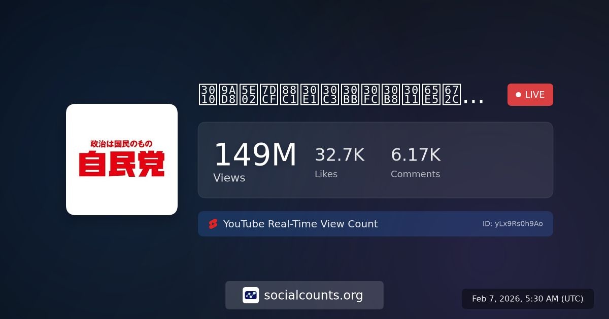 149,659,514 【高市総裁メッセージ】日本列島を、強く豊かに。 | Real-Time YouTube Live View Count | SocialCounts.orgTrackthereal-timeviewcountof【高市総裁メッセージ】日本列島を、強く豊かに。onYouTubewithSocialCounts.org.Stayupdatedontheviewgrowthandpopularityofthisrenownedvideo.Getaccurateinsightsi...socialcounts.org