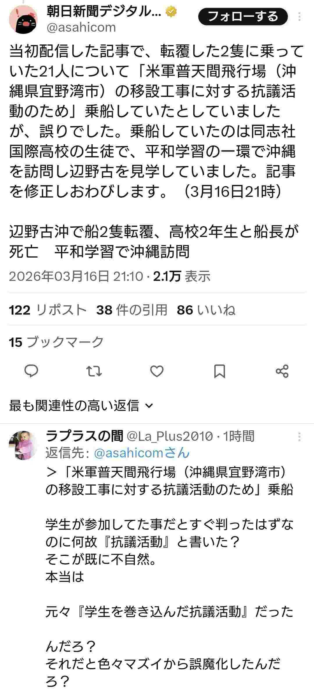 朝日新聞「当初配信した記事は”辺野古移設工事に対する抗議活動のため”としていましたが誤りでした」
