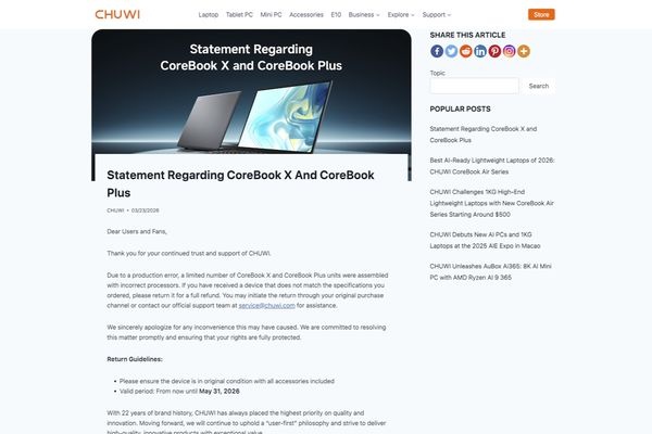 https://blog.chuwi.com/statement-regarding-corebook-x-and-corebook-plus/中国CHUWIは3月23日、同社の一部製品に誤って仕様と異なるCPUが搭載されていたとして、返品・返金対応を実施することを公表した。
