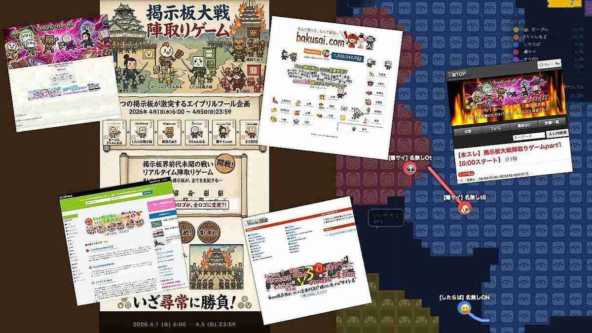今年、特に注目を集めたサイトが、国内最大のネット掲示板「爆サイ.com」をはじめとする「したらば掲示板」「まちBBS」「雑談たぬき」「おーぷん2ちゃんねる」など6つの掲示板のコラボだ。サイト名を賭けて、交わることのない競合掲示板による合同企画「陣取りゲーム」が4月1~5日に実施された。その結果、「おーぷん2ちゃんねる」が勝利し、6日から7日までの48時間、参加した全サイトのロゴ画像は「おーぷん2ちゃんねる」に取って代わられた。