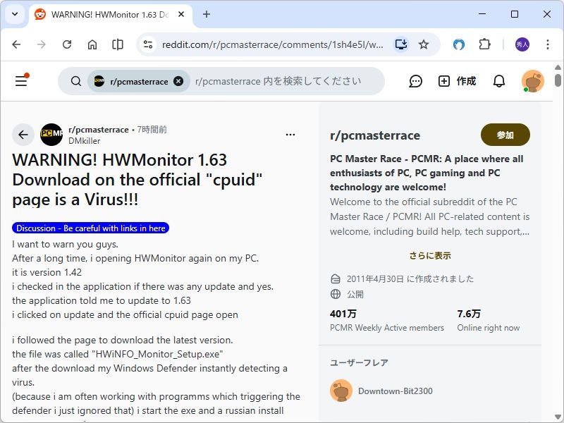 「CPUID」から「CPU-Z」や「HWMonitor」をダウンロードした場合、マルウェアが混入している可能性がある。