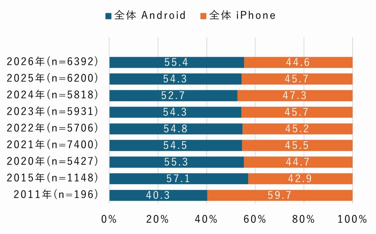 続いて、スマートフォンにおけるAndroidとiPhoneの比率を見ると、2026年はAndroidが55.4%、iPhoneが44.6%となった。例年通りAndroidがやや優勢となり、経年でも大きな変化は見られていない。