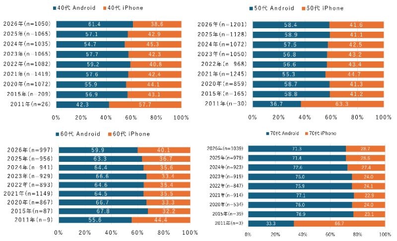 一方で、40代、50代、60代、70代の中高年層ではAndroidが6~7割を占めた。いずれの年代も大きな変動は見られないが、60代ではiPhone比率がやや上昇している。全体としては、年代が上がるほどAndroid比率が高くなる傾向が見られた。