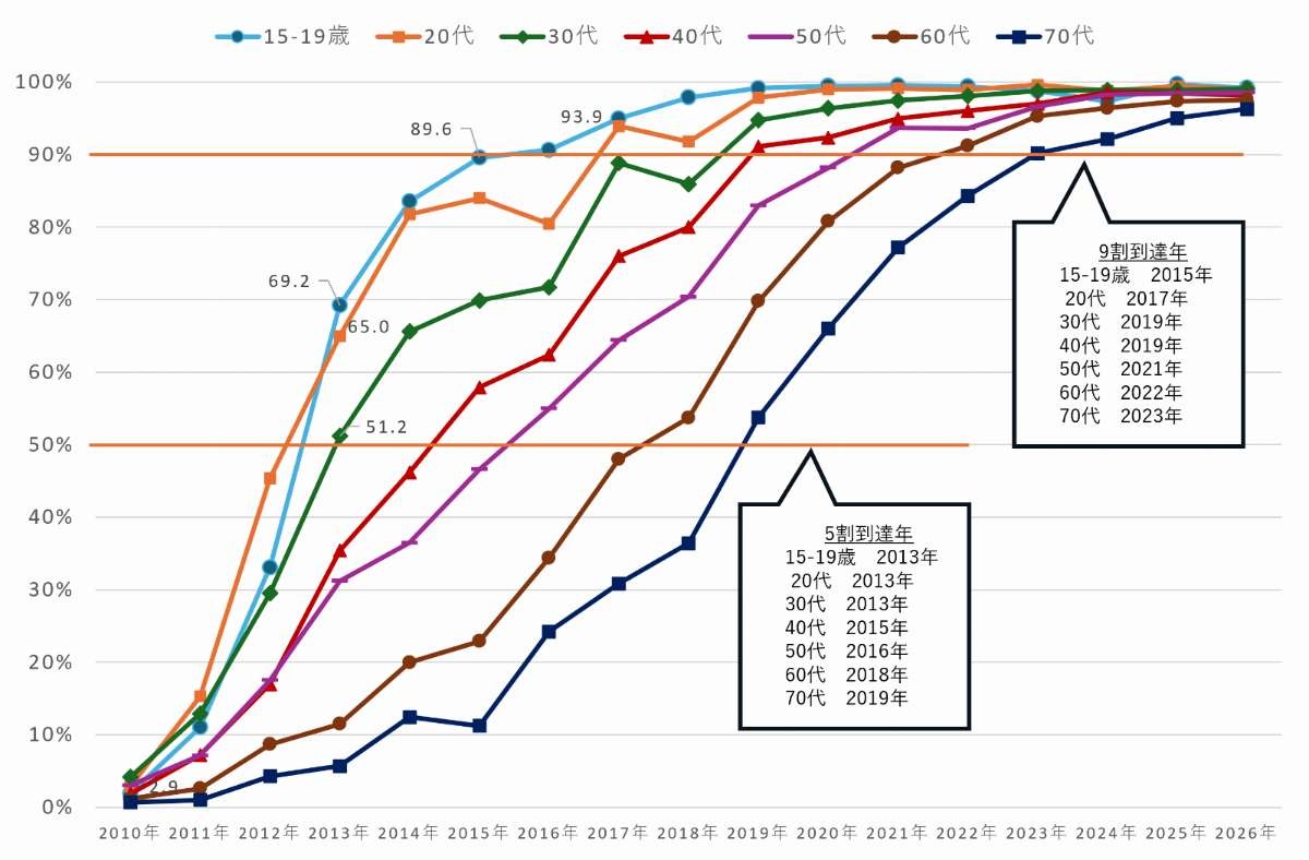 年代別に見ると、15~19歳、20代、30代といった若年層で早くから普及が進んでおり、2021年以降はシニア層でも9割を超えていた。