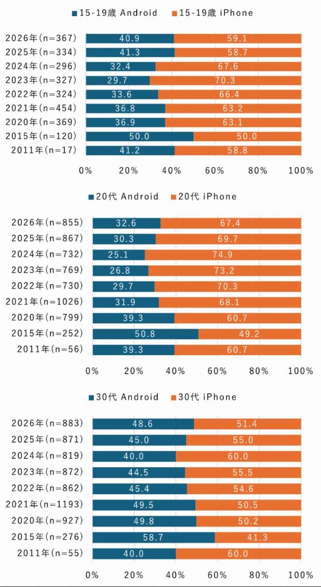 Android・iPhone比率を年代別に見ると、15~19歳、20代、30代ではiPhoneが優勢で、特に20代は全世代の中で最もiPhone比率が高かった。近年は若年層でもAndroid比率が上昇する傾向が見られており、30代ではおおむね拮抗していた。