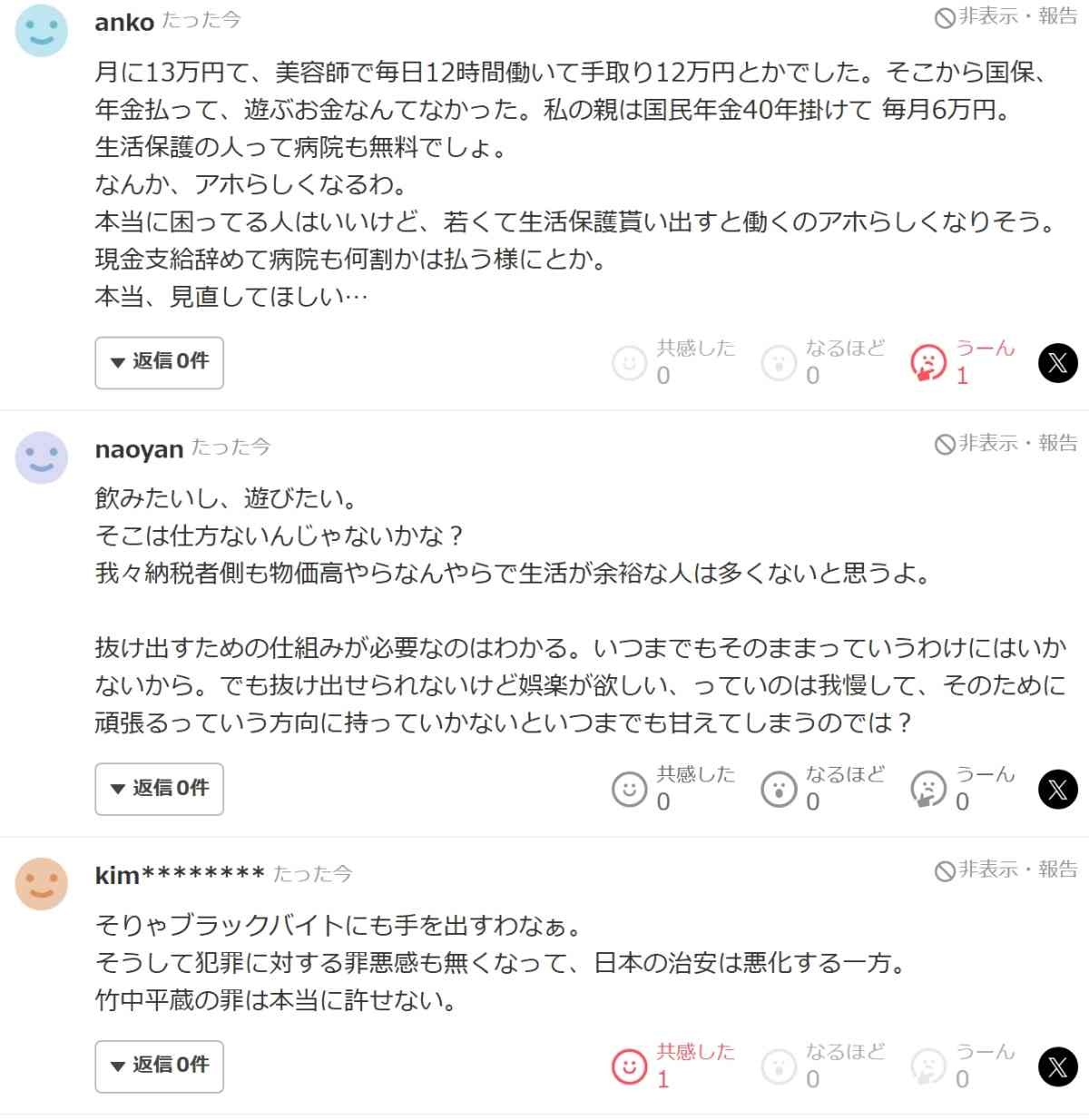 受給については「日本では、生活保護を取れるレベルの生活でも、実際に受け取っている人は2〜3割と言われる。ヨーロッパやドイツ、フランスでは7〜8割もらっている。もっと日本も上げていい」と語る。「無理してしがみついて悪化して、二度と戻れなくなるくらいなら、生活保護で健康になって働き直してもらった方が、生涯年収も納税額も増えるだろう」