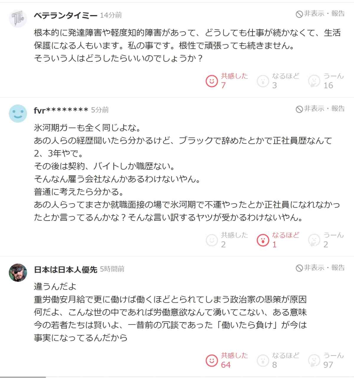 ヤフコメでもこの話題で氷河期叩きしてるバカおるやん
