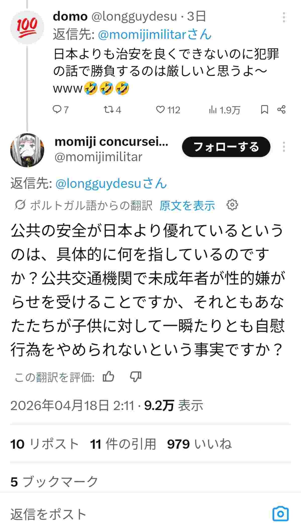 強姦件数が日本の10倍以上でそのほとんどが13歳未満に対する強姦とかいうロリコン大国のブラジルは未成年者の性被害には触れないほうがいいのに