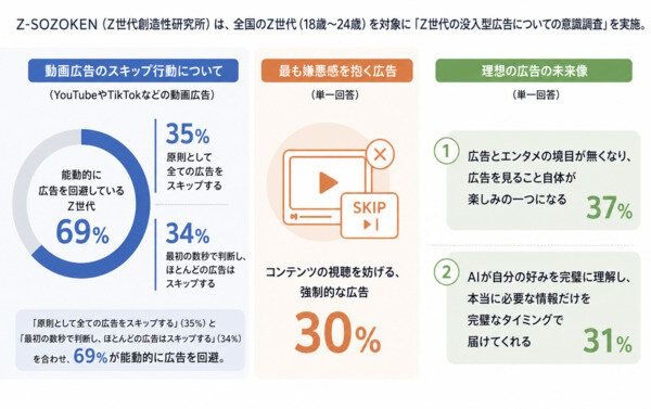 4/29(水) 12:00調査から、Z世代の約7割が即スキップするという結果が明らかになりました。