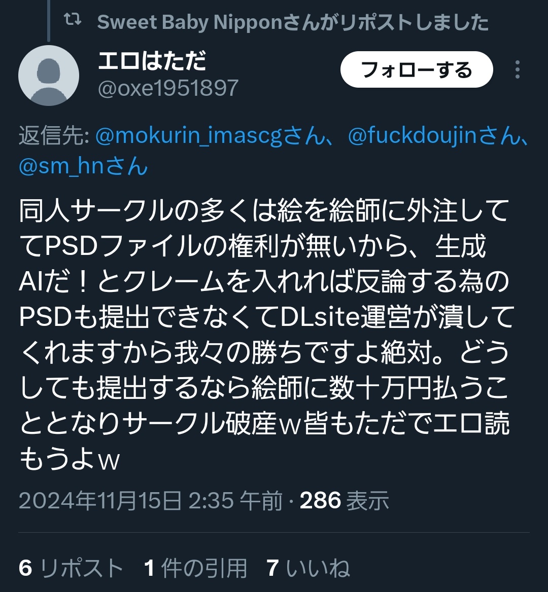 反AI、購入したDLsiteの手描き同人に、「この作品AIでは?」とクレームをつけることでタダ読み&返金という極悪ライフハックを活用してしまう… - 2 : 2024/11/24(日) 09:32:39.44 ID:9mxRFour0