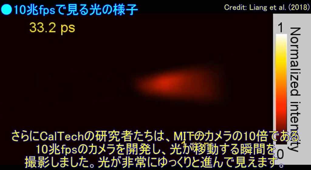 光は一秒間に29万kmも進むのでカメラの枠外にあっという間にフレームアウトしてしまう。光が1メートル移動する様子を記録するには344コマで足りる。