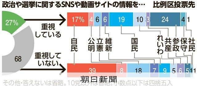 比例区の投票先を明らかにした人を分析すると、SNS重視層では参政を挙げた人が最多の24%で、国民民主が19%、自民が17%で続いた。れいわは10%、立憲、維新が各6%。公明、保守が各4%で、共産は3%、NHK党、再生の道が各2%だった。