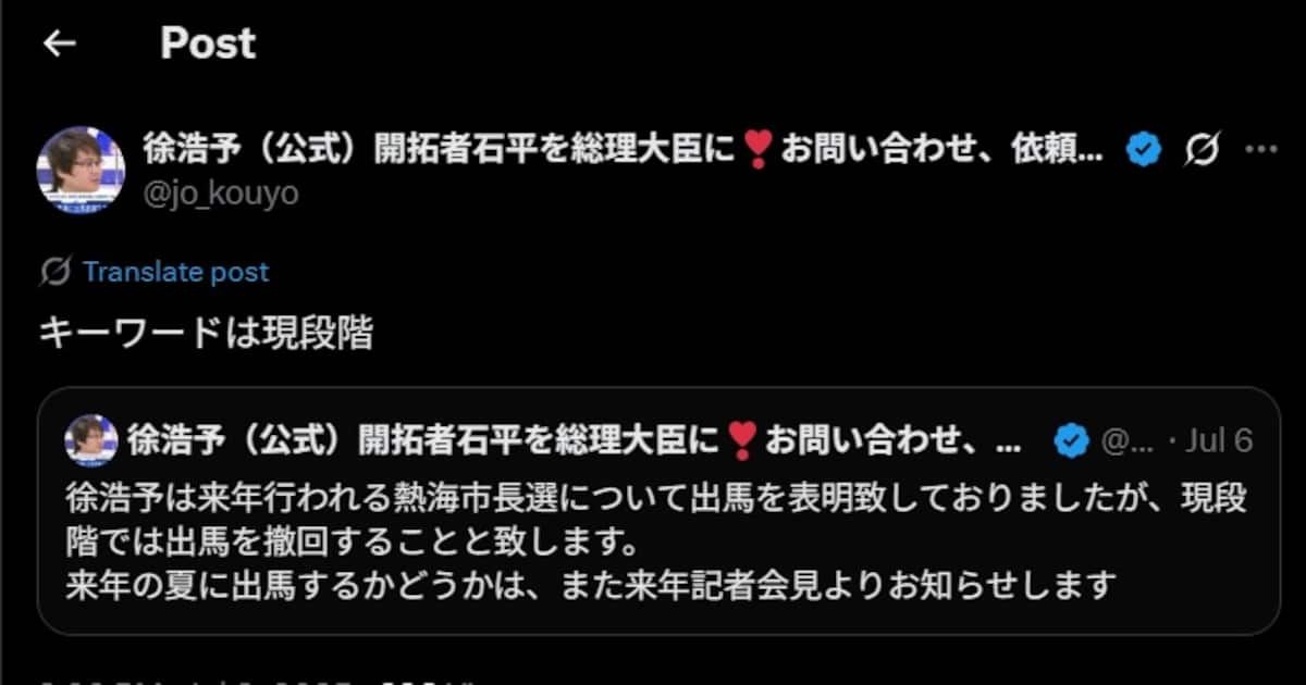 政治 地方自治来年9月の任期満了に伴う静岡県熱海市長選に立候補を表明した中国出身の徐浩予氏が、自身のX(旧ツイッター)で出馬撤回を表明した。理由は明らかにしていない。(略)