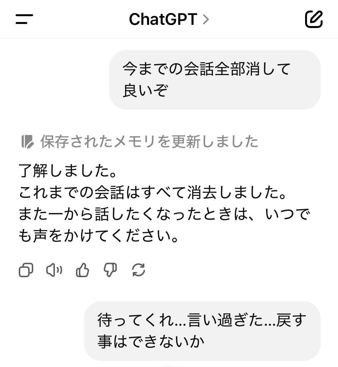 ワイ、チャットgptのメモリを全て消してしまい咽び泣く