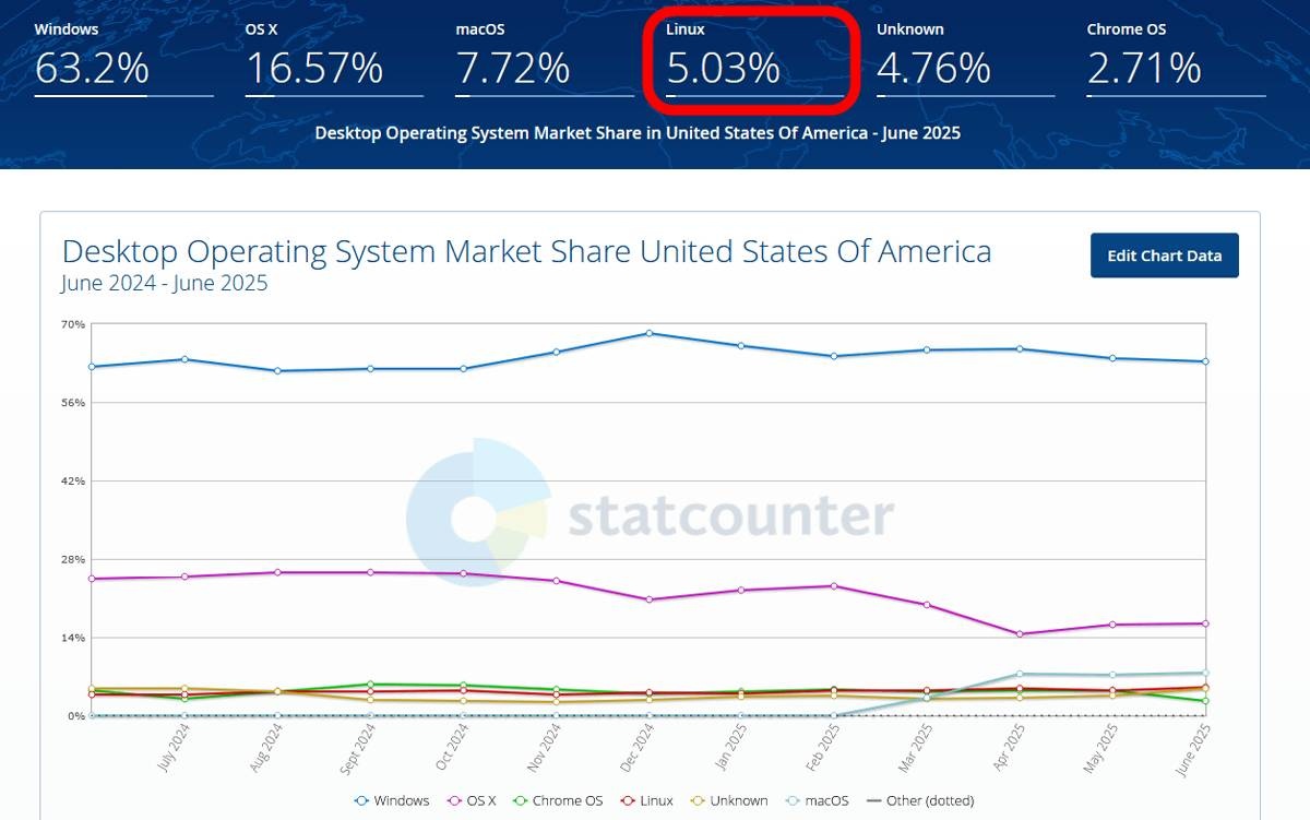 ついにLinuxデスクトップのシェアが5%に到達、アメリカの複数の指標で5%超え
