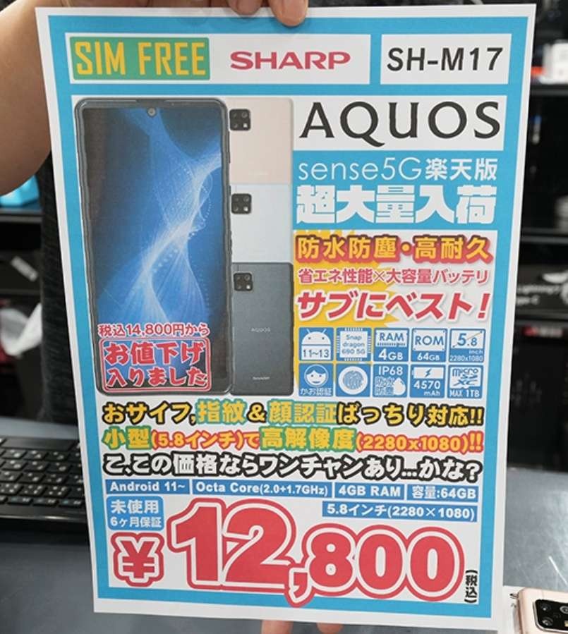シャープの5G対応5.8インチスマートフォン「AQUOS sense5G(SH-M17)」未使用品が、イオシス各店でセール中。販売されているのは「楽天版SIMフリー」(同店)で、セール価格は12,800円。カラーはライトカッパーとオリーブシルバーで、同店通販サイトによると、在庫は合計700台以上あるようです。