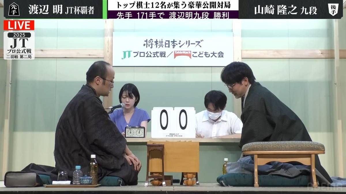 将棋日本シリーズJTプロ公式戦2回戦第2局が8月16日、新潟市の「新潟市産業振興センター」で行われ、前年覇者の渡辺明JT杯覇者(41)が山崎隆之九段(44)に171手で勝利した。準決勝進出を決めた渡辺JT杯覇者は、10月12日に予定されている東海大会で、藤井聡太竜王・名人(王位、王座、棋聖、棋王、王将、23)と対戦する。