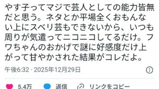 やす子、マジで嫌われ始める。Xのやす子嫌いツイートが5.5万いいね