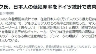 イーロンマスク「日本国民が濡れ衣を着せられたのだろう」ドイツ在住の日本人犯罪率の低さを称えてネット民ホルホル