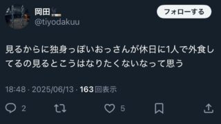 嫌儲 X民「ぎゃああああああああ休日に1人で飲食店きてる独身おじさん気持ち悪いオエエエエエエエ🤮🤮🤮」